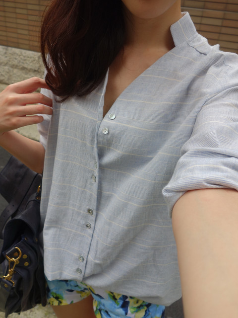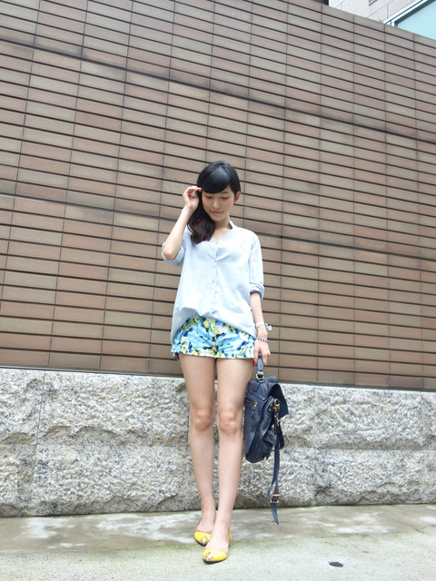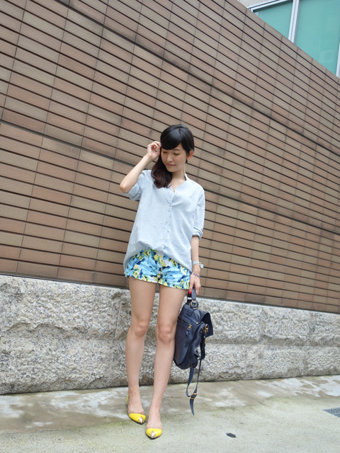 這天的搭配是淺藍色條紋襯衫, 海軍藍的包包, 黃色尖頭鞋