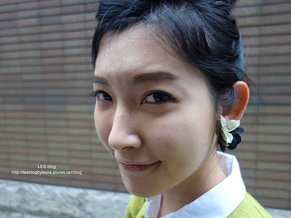 青綠色針織衫加上花朵耳環, 用單品表達出春天的感覺